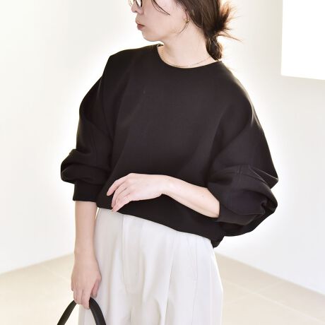 コンパクトなクルーネックと着丈、変形のドロップショルダーで、ラフすぎず女性らしい印象に。