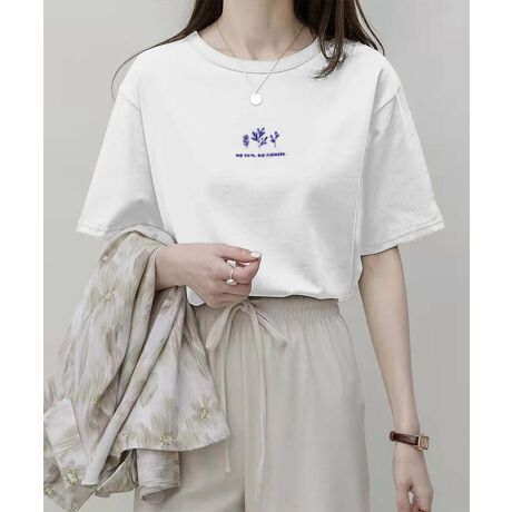 シンプルなデザインながらも胸元のプリントが上品なポイントになり、大人カジュアルにぴったりの一枚です。