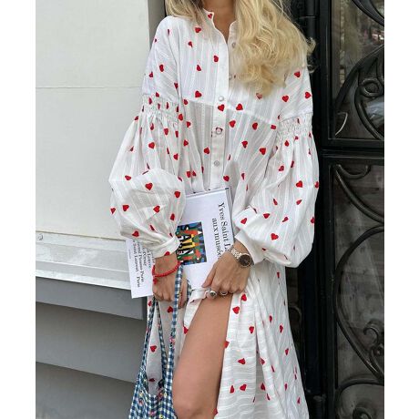 遊び心のあるハート柄が目を引く、愛らしいシャツワンピース。