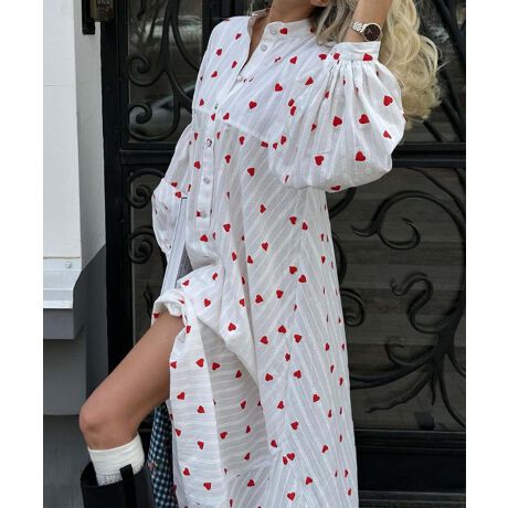 遊び心のあるハート柄が目を引く、愛らしいシャツワンピース。