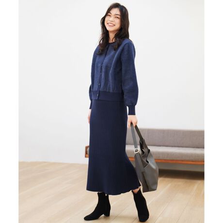 ・セットアップとしてはもちろん、別々でも着用できるアイテム・着回しのきくショート丈のフェザーカーディガンと、程よいフレア感のあるリブニットスカートのセット・タイト過ぎないシルエットになっているので、セットアップが苦手な方でも着用しやすい