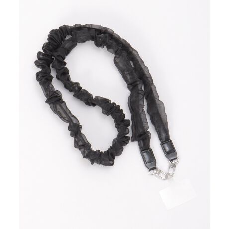 光沢感のあるフェイクレザーのストラップに、透け感が魅力のオーガンジー生地をあしらったスマホストラップ。