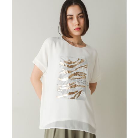ボディには水面をイメージしたマーブル模様+薄いシフォンに箔のゼブラプリントを施し、レイヤードしたデザインプルオーバーです。マーブルと箔のゼブラが重なり合うことで絶妙な柄の仕上がりになり、立体感が生まれます。カーディガンなども羽織りやすい袖丈にしています。