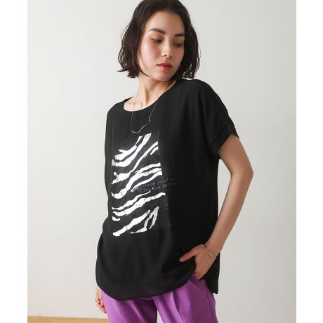 ボディには水面をイメージしたマーブル模様+薄いシフォンに箔のゼブラプリントを施し、レイヤードしたデザインプルオーバーです。マーブルと箔のゼブラが重なり合うことで絶妙な柄の仕上がりになり、立体感が生まれます。カーディガンなども羽織りやすい袖丈にしています。