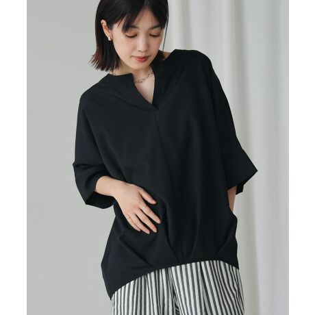 首周りは、キーネックですっきりとしたシルエット。袖の太めのカフスが、リラックス感の中に大人の装いをプラスしてくれます。裾のタックや、着丈の前後差がお腹やお尻周りの、気になる部分をさりげなくカバー。1枚で活躍するブラウスです。