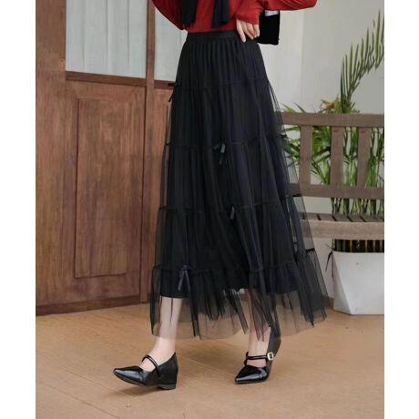 ふんわりとしたチュール素材が女性らしさを引き立てるロングスカートです。軽やかで透け感のあるデザインに、小さなリボンがアクセントとなり、上品さと可愛らしさを兼ね備えています。カラーは黒、ベージュ、ホワイトの3色展開で、どのシーンにも合わせやすいカラーバリエーションが魅力です。