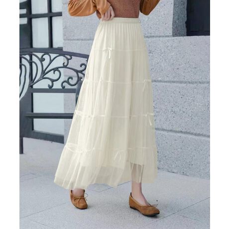 ふんわりとしたチュール素材が女性らしさを引き立てるロングスカートです。軽やかで透け感のあるデザインに、小さなリボンがアクセントとなり、上品さと可愛らしさを兼ね備えています。カラーは黒、ベージュ、ホワイトの3色展開で、どのシーンにも合わせやすいカラーバリエーションが魅力です。