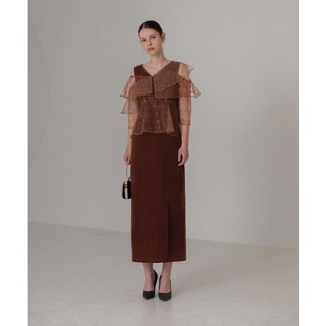 ユニークなデザインのフリルビスチェにスパンコールとチェック刺繍を施し、華やかさと立体感を演出。