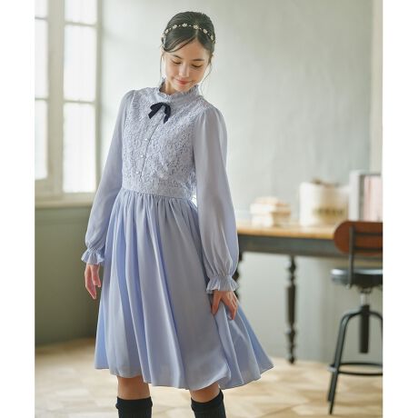 ■デザイン高級感のあるレースを上身頃に使用し、上品な透け感のあるシフォンジョーゼットをドッキングしたワンピースです。スタンドカラーとリボンタイ風のブローチがトレンドライクなエレガンスな印象を与えてくれます。たっぷりとギャザー分量をとっているので、スカートのシフォンも歩いときにふわりと広がり、華やかな印象を与えてくれます。