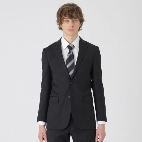 【さりげないブルーストライプが特徴的なブラックストライプスーツ】