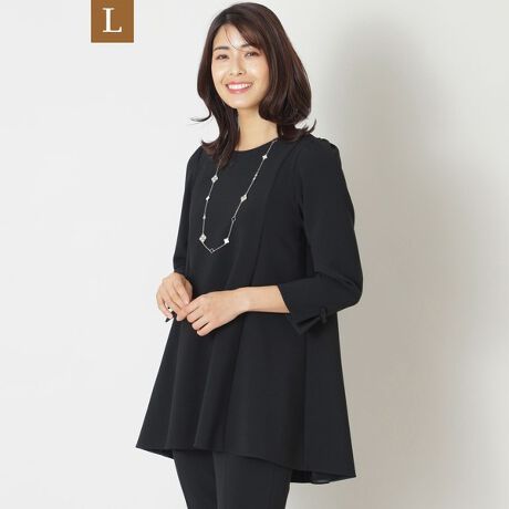 肩部分からのパネルラインで縦長効果を出したスッキリとしたシルエットのチュニックです。袖口はスリットを入れリボンを付けアクセントを効かせています。