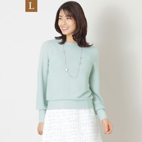 ボーダー状の編み表情が特徴的なガーター編でコンパクトでシンプルなデザインながらも、スパンコール糸の華やかな光沢感とボリュームスリーブがエレガンスカジュアルなスタイルを演出するニットです。