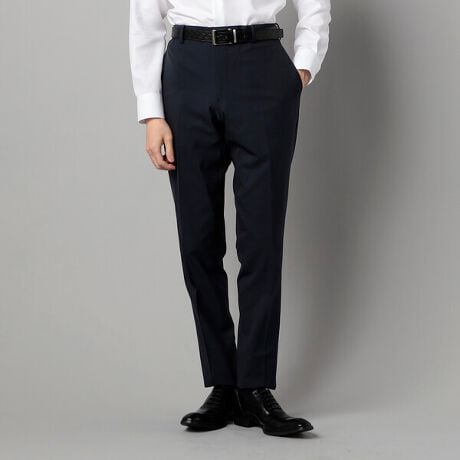 スラックスは膝から裾にかけてシェープを効かせたテーパードシルエットで、美脚効果が期待できます。