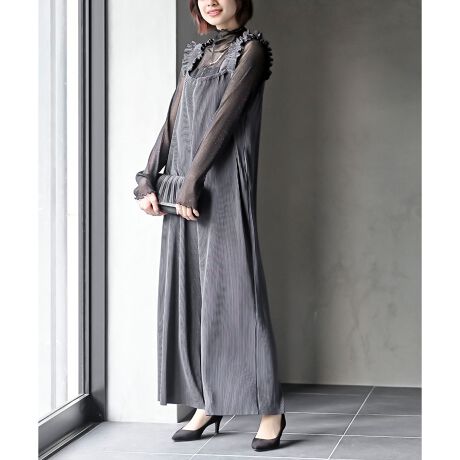 光沢のある細プリーツの生地が優雅な雰囲気に。