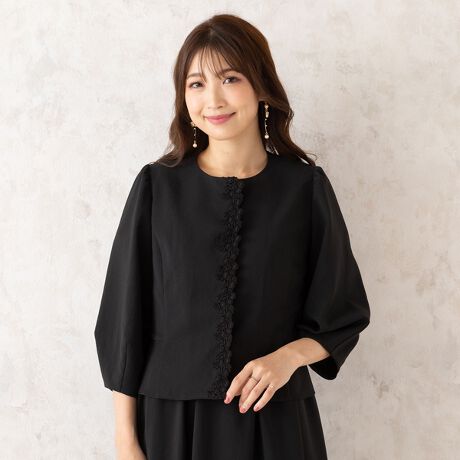 ボリュームを持たせた袖に脇から後ろにかけて切替えたフリルがおとな可愛いノーカラージャケット。