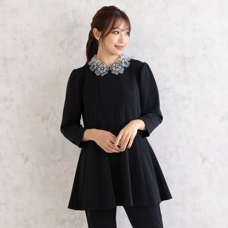 オーガンジーのフラワー襟が上品なフレアシルエットのブラウス。