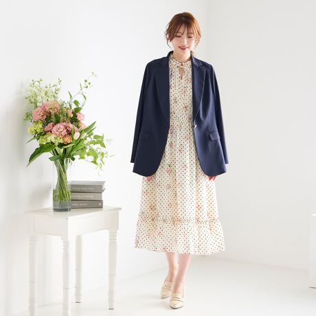 フリル襟に控えめなリボンのブラウス風デザインとふんわりボリュームを持たせたスカートが愛らしく上品な雰囲気に仕上げました。