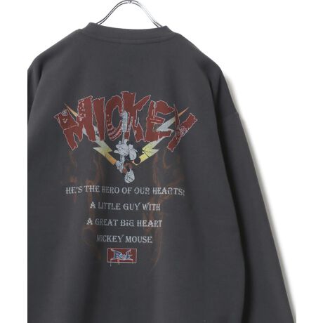 ミッキーがギターを持ったロックバンド風のイラストをフロント、バックにプリントしたトレンドの古着風スウェットトレーナーになります。