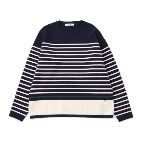 ボーダー柄をベースに裾廻りのパネルと、配色のラインがアクセントとなるクルーネックニット。