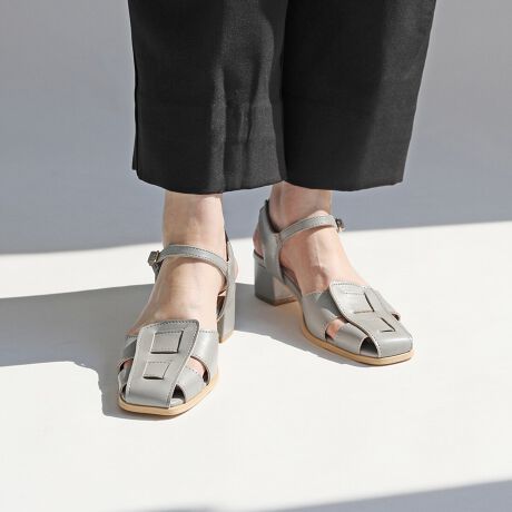 トレンドのグルカデザインにヒールがついた大人顔のサンダル。スクエアトゥがよりスッキリとした印象に。