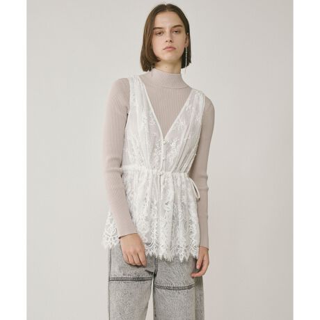 日常の装いに華を添える、フェミニンムード漂うノースリーブブラウス。コードがしっかりたっているが柔らかい、繊細で高級感のあるリバーレースを贅沢に使用。旬なレイヤードを楽しめる様、あえてチュール素材とレイヤードさせてシアーな重なりを楽しめる一枚に仕上げました。裾はレースの柄をいかしたスカラップで処理した美しい仕様に拘り、リュクスな中にも女性らしい色香を纏う一枚に。小さなくるみ釦やサイドの華奢なリボンなど、可愛らしいディティールを取り入れたのもポイントです。ニットを上から重ねて裾からちらりとスカラップを覗かせたり、中にハイネックを添えた今季らしいレイヤードスタイルまで、様々な着回しをお楽しみください。