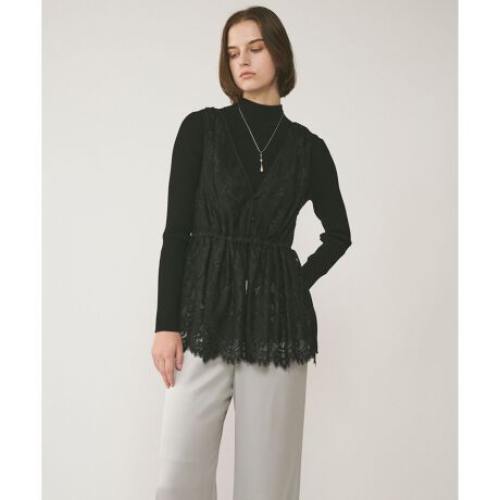 日常の装いに華を添える、フェミニンムード漂うノースリーブブラウス。コードがしっかりたっているが柔らかい、繊細で高級感のあるリバーレースを贅沢に使用。旬なレイヤードを楽しめる様、あえてチュール素材とレイヤードさせてシアーな重なりを楽しめる一枚に仕上げました。裾はレースの柄をいかしたスカラップで処理した美しい仕様に拘り、リュクスな中にも女性らしい色香を纏う一枚に。小さなくるみ釦やサイドの華奢なリボンなど、可愛らしいディティールを取り入れたのもポイントです。ニットを上から重ねて裾からちらりとスカラップを覗かせたり、中にハイネックを添えた今季らしいレイヤードスタイルまで、様々な着回しをお楽しみください。