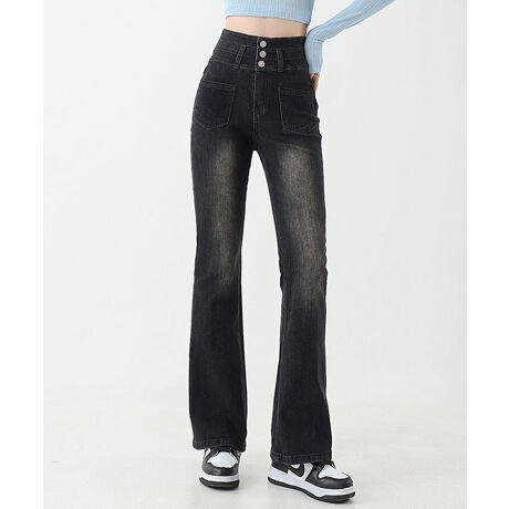 ハイウエスト仕様でスタイルアップ効果が狙える、美シルエットのセミフレアデニムパンツ。