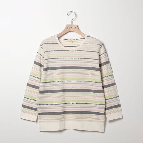 マルチカラーのボーダーで華やかな表情に仕上げたニットトップス。コットンを使用したジャカードニットは、肌当たりの良さも満点です。開きが控えめなボートネックが、上品な着こなしを演出。身頃に適度なゆとりがあり、バランスの取れたスタイリングを楽しめます。ボーダーながらもカジュアルになりすぎないのが魅力です。