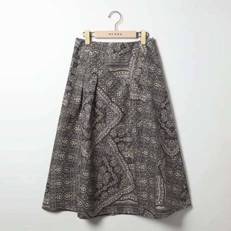 オリエンタルなムード漂う繊細な模様が描かれたジャカードサラサスカート。裾に向かって緩やかに広がるフレアシルエットが美しく、スタイリングの主役にふさわしい華やかさと上品さを兼ね備えています。トップスはシンプルなブラウスやニットと合わせて着こなしていただくと洗練された表情に。