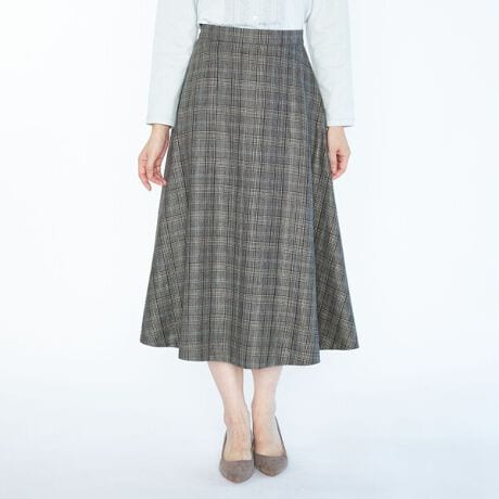 トラディショナルな雰囲気を纏えるチェック柄のツイードスカート。表地にイギリス製の毛と麻のブレンド生地を採用。トップスインがきれいに仕上がるハイウエストデザイン。裾に向かって優美に広がるフレアシルエットが美しく、エレガントなスタイルを叶えてくれます。