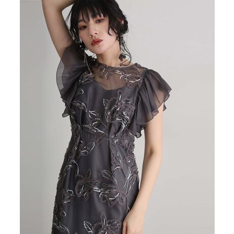 立体感のあるラメ糸を使用した刺繍が華やかな存在感を放つ一着。