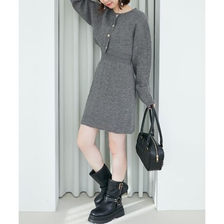 ケーブル編みが上品な印象を漂わせるクルーネックのカーディガンとノースリーブのニットワンピースセット。