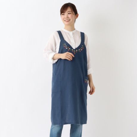 落ち着いたネイビーのエプロンに可愛いいちご刺繍を施しました。