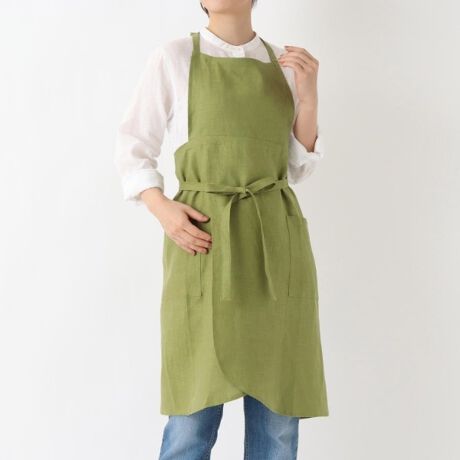 ほどよいハリ感で、肌触りのよいリネン100%のエプロン。リネンならではの光沢感が美しい素材です。