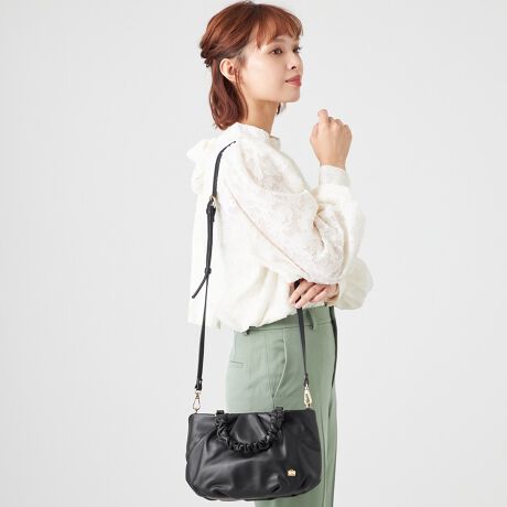 シャーリングを寄せたハンドルは、シュシュのようにクシュっとしたかわいらしい見た目に。手で握った時に柔らかく、持ちやすいものに仕上げました。