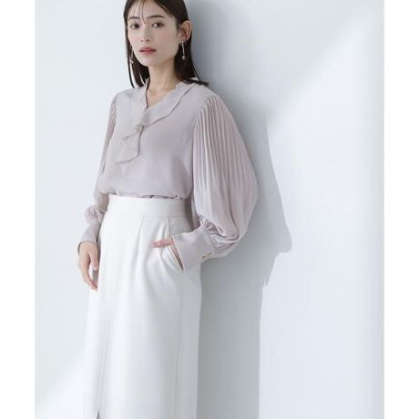 スキッパーネックにラッフルフリルのデザインで、首まわりをすっきりと見せながら、大人フェミニンな印象で着られるキレイめブラウス。袖はアコーディオンプリーツで華奢見えしながら、ふんわりとしたボリューム感を出した華やかな一枚。スカートでもパンツでも相性が良く、デイリーでもオフィスシーンでも着まわし力は抜群です。<素材>軽く柔らかい風合いの楊柳素材を使用。袖はアコーディオンプリーツ加工を施しています。<詳細>仕様・後ろボタン裏地・あり透け感・ややあり / 光沢・なし / 伸縮性・ややあり 生地の厚さ・薄手※モデルの着用画像の場合、光の当たり具合により、実際の色味と異なって見えることがございます。