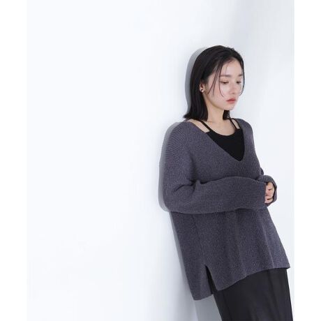 深めに開けたVネックのオーバーニットとインナーキャミソールのアンサンブルです。キラリと優しいラメ感とMIX感が愛らしいニットアイテム。重ね着をした時に見える肩紐デザインと配色がスタイリングのポイントになります。単品使いでお持ちのアイテムともレイヤードができるので、コーディネートの幅が広がります。<素材>3種類の糸(細いブークレー糸、コットン糸、ラメ糸)を組み合わせて畦編みをしたMIXニットです。<詳細>仕様・開閉なし裏地・なし透け感・なし / 光沢・あり / 伸縮性・あり 生地の厚さ・普通※モデルの着用画像の場合、光の当たり具合により、実際の色味と異なって見えることがございます。