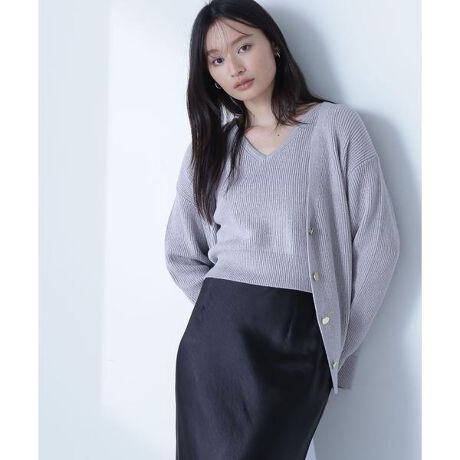 ミドル丈のボクシーカーディガンとVネックトップスのアンサンブルです。カーディガンはゴールドカラーの釦がポイントで、Vネックトップスはタンクトップとしてもベストとしても着用可能。単品使いもできるベーシックなデザインなので、コーディネートの幅が広がります。<素材>細めなテープヤーンで畦編みしたニットを使用。ストレッチが効いて畦目もキレイに立ちながらダレにくい素材、もちもちしたタッチです。<詳細>仕様・カーディガンは前ボタン、Vネックトップスは開閉なし裏地・なし透け感・なし / 光沢・あり / 伸縮性・あり 生地の厚さ・普通※モデルの着用画像の場合、光の当たり具合により、実際の色味と異なって見えることがございます。