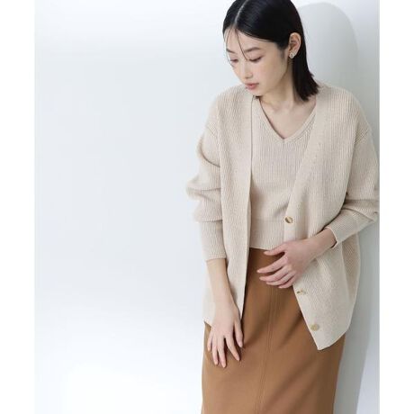 ミドル丈のボクシーカーディガンとVネックトップスのアンサンブルです。カーディガンはゴールドカラーの釦がポイントで、Vネックトップスはタンクトップとしてもベストとしても着用可能。単品使いもできるベーシックなデザインなので、コーディネートの幅が広がります。<素材>細めなテープヤーンで畦編みしたニットを使用。ストレッチが効いて畦目もキレイに立ちながらダレにくい素材、もちもちしたタッチです。<詳細>仕様・カーディガンは前ボタン、Vネックトップスは開閉なし裏地・なし透け感・なし / 光沢・あり / 伸縮性・あり 生地の厚さ・普通※モデルの着用画像の場合、光の当たり具合により、実際の色味と異なって見えることがございます。