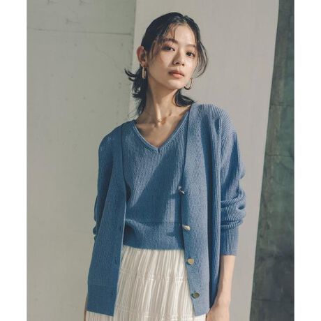 ミドル丈のボクシーカーディガンとVネックトップスのアンサンブルです。カーディガンはゴールドカラーの釦がポイントで、Vネックトップスはタンクトップとしてもベストとしても着用可能。単品使いもできるベーシックなデザインなので、コーディネートの幅が広がります。<素材>細めなテープヤーンで畦編みしたニットを使用。ストレッチが効いて畦目もキレイに立ちながらダレにくい素材、もちもちしたタッチです。<詳細>仕様・カーディガンは前ボタン、Vネックトップスは開閉なし裏地・なし透け感・なし / 光沢・あり / 伸縮性・あり 生地の厚さ・普通※モデルの着用画像の場合、光の当たり具合により、実際の色味と異なって見えることがございます。