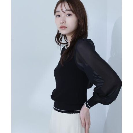 裾と袖のシェルタックディテールが愛らしいリブニット。身頃はレース柄のような変形リブにし、袖は透け感を抑えたシフォンジョーゼットを合わせています。襟、袖口、裾のリブに入れたバイカラーラインがポイント。普段使いはもちろん、オフィススタイルにも上品な印象で着ていただけます。<素材>身頃は肌触りの良いハイゲージニット、袖は透け感が少ないシフォン素材を使用しています。<詳細>仕様・開閉なし裏地・なし透け感・なし / 光沢・なし / 伸縮性・身頃はあり、袖はなし 生地の厚さ・身頃は普通、袖は薄手※モデルの着用画像の場合、光の当たり具合により、実際の色味と異なって見えることがございます。色味は、商品単体の画像をご参照ください。
