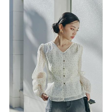 トレンドのペプラムブラウスは、程よい光沢のゴールドカラー釦がポイント。後ろウエストは高い位置でゴムシャーリングを入れ、スタイル良く見せながら動きやすいデザインに。ふわっとしたシアー素材を使用、ドットプリントはオリジナルです。<素材>シアーなポリエステル素材を使用しています。<詳細>仕様・前ボタン裏地・あり透け感・あり / 光沢・なし / 伸縮性・なし 生地の厚さ・薄手※モデルの着用画像の場合、光の当たり具合により、実際の色味と異なって見えることがございます。色味は、商品単体の画像をご参照ください。