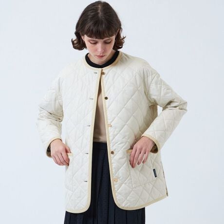 ゴールドのメタルボタンが、華やかなアクセントに。全体的なコンパクトさがありながら、保温性のある中綿を使用しており、身軽さと暖かさを兼ね備えた一着です。