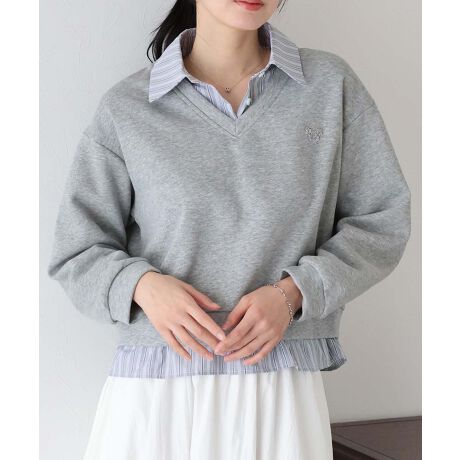トラッド感のあるスウェットにストライプシャツをレイヤードさせたおしゃれ見えする時短トップス。