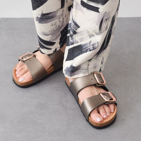 甲を覆うベルトで安定感のよい履き心地のフットベッドダブルベルトスライドサンダル。