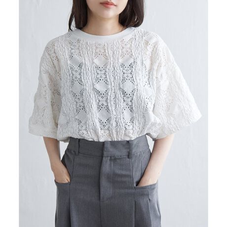 ゆったりとしたシルエットがレースの甘さに抜けをつくり、日常使いしやすいバランスです。