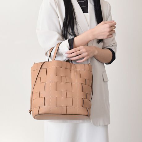 編み込みレザー風のデザインが特徴的なレザーバケットバッグは、内側に巾着袋が付いているのも嬉しいポイント。