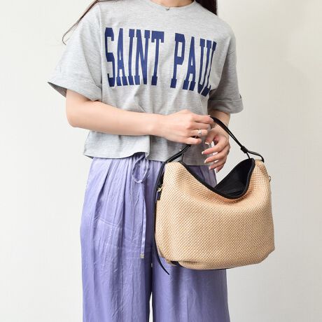 ラフィアとレザーのコンビネーションが春夏らしい印象のハンドバッグです。ストラップ付。