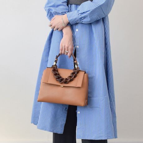 シボ感のあるソフトなレザーを使用したハンドバッグは同系色のアクリルチェーンがフェミニンな印象です。