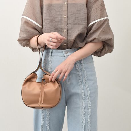 小ぶりなサイズ感のレザーホーボーバッグは、持ち手部分の金具を留めてフォルムの変化も楽しめます。